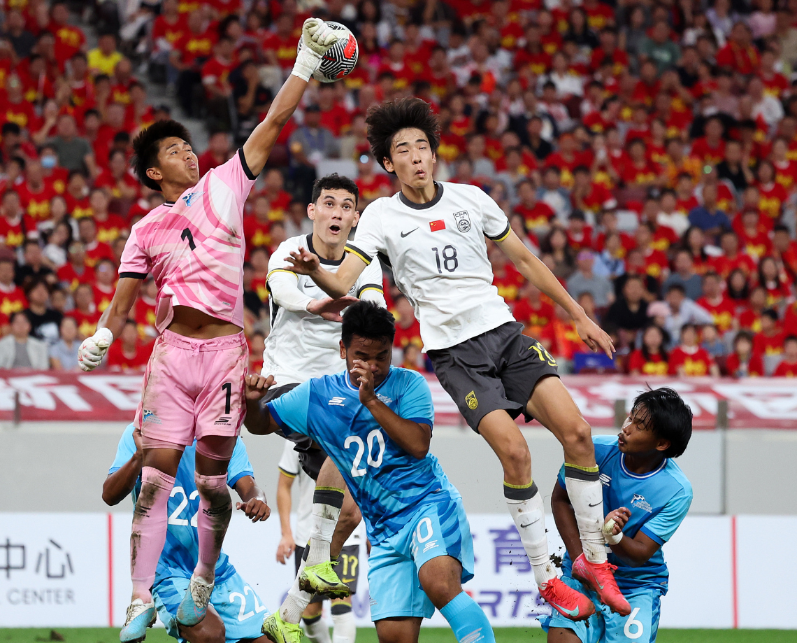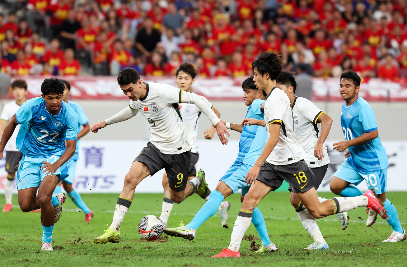第67分钟王钰栋再度发威,强行突破造成防守球员禁区内犯规,为国足赢得一粒点球,王钰栋亲自主罚命中,将领先的优势进一步扩大到了4-0,仅仅过了4分钟,王钰栋直接兜射破门,比分也来到了5-0,找到感觉的国足,第75分钟连入2球,先是蒯纪闻锦上添花,随后王钰栋又助攻拜合拉木爆射建功,分差也来到了7-0,接下来拜合拉木和朱鹏宇分别建功,比分来到了9-0,比赛最后时刻王钰栋轰出世界波,将比分定格为了10-0。